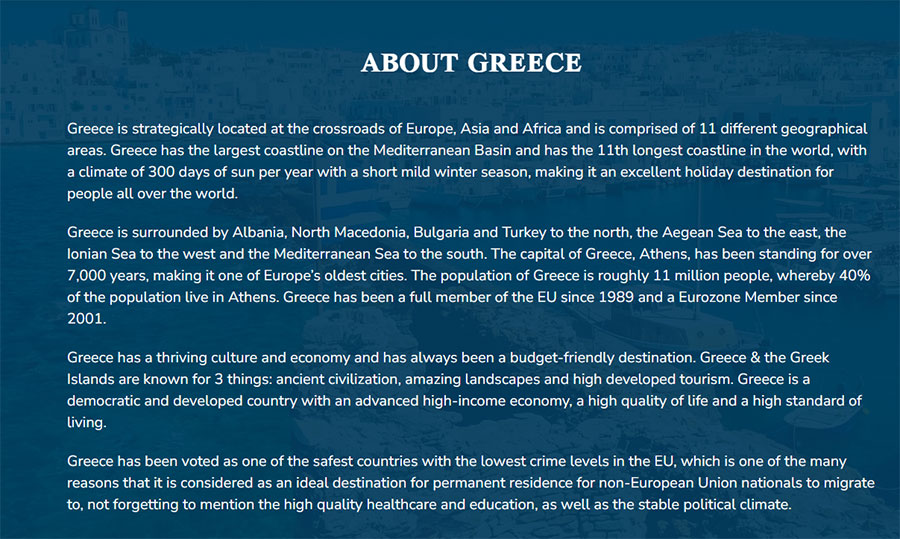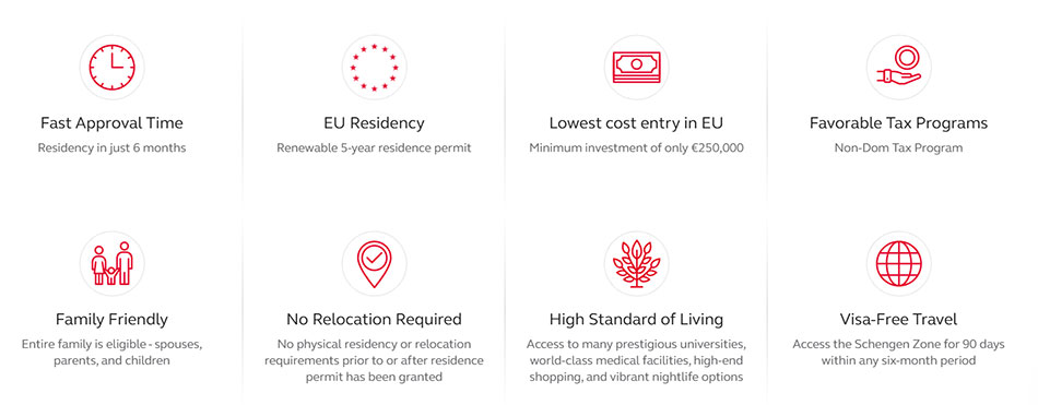 Being located in Southern Europe and possessing an archipelago of about 2,000 islands, Greece offers its residents and citizens a number of benefits including high levels of safety and security, as well as education and healthcare resources. The Golden Visa enables non-EU nationals and their family members to obtain permanent residence permit in Greece, which may be renewed every five years.
